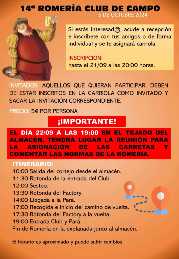 Si estás interesado, acude a Recepción e inscríbete con tus amigos o independiente y se te asignará carriola. La fecha límite de inscripción es hasta el 21 de septiembre a las 20:00 horas. Al día siguiente (22/09) a las 19:00 horas en el tejado del almacén tendrá lugar la reunión para la asignación de las carretas y comentar las normas de la Romería.