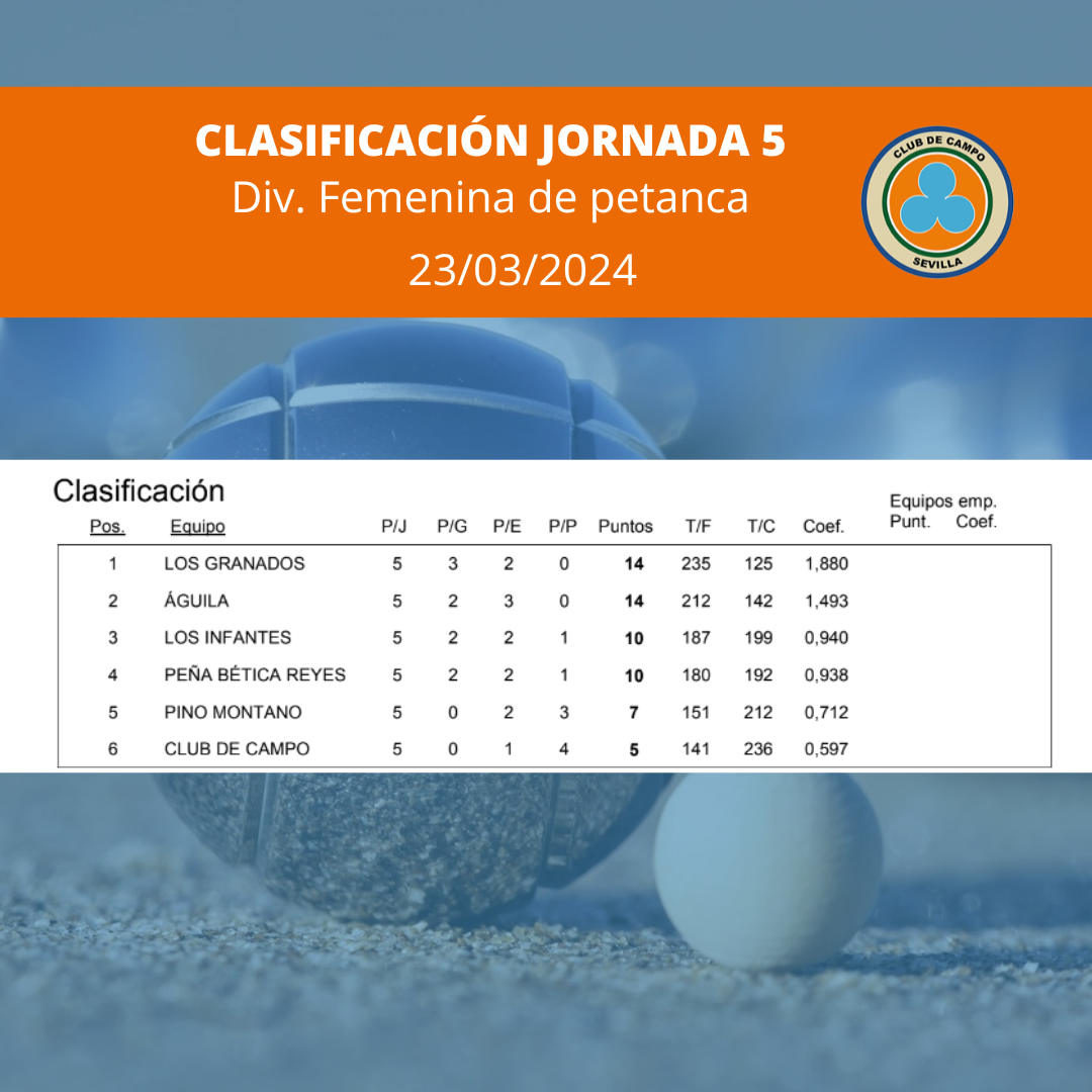 El pasado 23 de marzo tuvo lugar la 5ª Jornada de la División Femenina de la Liga de Petanca 2024. Conoce los resultados de esta jornada en la siguiente imagen: