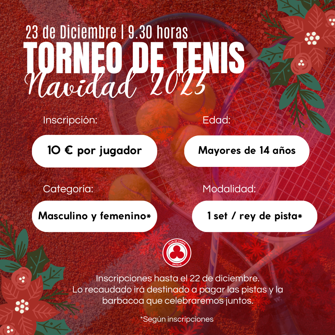 El próximo sábado 23 de diciembre, el Club de Campo Sevilla organiza un Torneo de Navidad de Tenis para todos los socios y aficionados a este deporte.